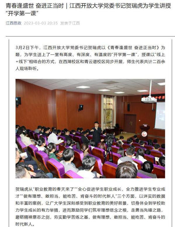 3月2日下午,米兰app入口站官网党委书记贺瑞虎以《青春逢盛世奋进正当时》为题,为学生送上了一堂有高度、有深度、有温度的“开学第一课”。3月3日,江西思政微信公众号对此进行报道。原文地址:青春逢盛世 奋进正当时|米兰app入口站官网党委书记贺瑞虎为学生讲授“开学第一课”