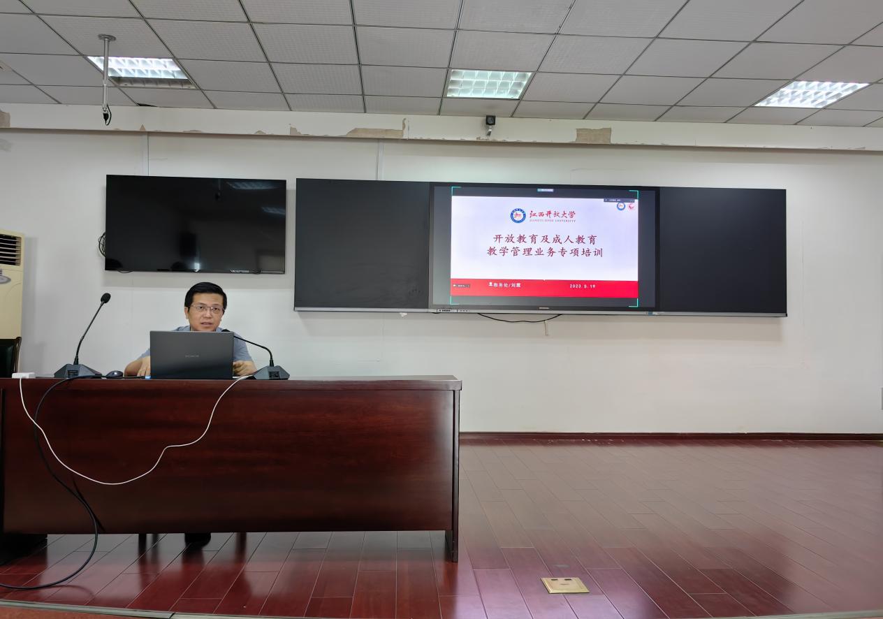 为普及开放教育、成人教育的基本内涵,切实提高全校教师对多种教育类型的认识和理解,5月19日上午,教务处在青云谱校区图书馆学术报告厅组织开展开放教育及成人教育教学管理业务专项培训。培训通过线上线下相结合的方式开展,各学院的教学教务人员及相关教师近60人参与本次培训。培训会由教务处负责人主讲,人文与健康学院副院长主持。