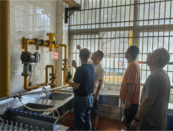检查组一行重点对学校各校区食堂燃气使用是否安全、用火用电是否符合规范、灶具是否有熄火保护装置、液化气罐阀门管线是否完好、燃气灶具连接方式是否正确,燃气报警装置是否正常运行等进行了认真细致的排查,同时对各食堂消防器材和电器线路进行了检查。要求各食堂负责人务必做好燃气供气设施设备、灶具燃气设施等定期自检维护工作,做到燃气安全制度齐全、管理台帐完整规范、责任落实到位,保证燃气使用安全。对排查出的问题,要求各食堂在假期整改到位,确保新学期开学前消除各类燃气安全隐患。