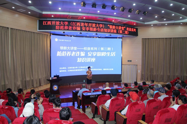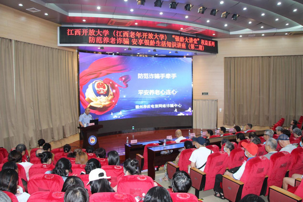 为推动主题教育走深走实、践行为民服务初心使命,贯彻落实习近平总书记关于加强新时代老龄工作的重要指示批示精神,进一步提升老年居民对各类诈骗行为的鉴别力和防范力,切实提高老年人依法维权和自我保护意识,7月11日上午,米兰app入口站官网(江西老年开放大学)联合江西省社区教育指导中心、江西省科学技术协会和赣州市公安局,共同开展“银龄大讲堂”(第二期)权益系列——“防范养老诈骗 安享银龄生活”知识讲座。本次讲座线上线下同步开启,全省11个地市开放大学(社区教育指导中心)和长天集团康养中心组织了线上集中收看,近150人现场参加了活动,线上直播观看量达5000余人。米兰app入口站官网党委书记贺瑞虎亲临现场指导活动开展,米兰app入口站官网校党委委员、副校长、江西老年开放大学校长冯豫红及江西老年开放大学有关成员单位负责人出席活动。