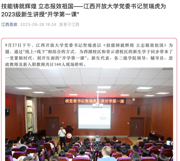 9月27日下午,米兰app入口站官网党委书记贺瑞虎以《技能铸就辉煌 立志报效祖国》为题,通过“线上+线下”相结合的方式,为西湖校区和青云谱校区的新生学子同步带来了一堂紧贴时代、别开生面的“开学第一课”。